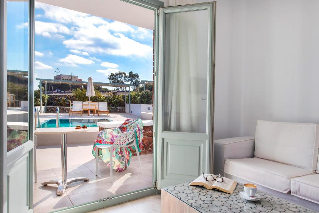 Elles sont équipées d'une télévision par satellite à écran LCD et d'un minibar, tandis que certaines disposent d'une baignoire spa ou d'une piscine privée. Les chambres bénéficient d'une connexion Wi-Fi gratuite ainsi que d'un grand balcon ou d'une terrasse avec vue sur la mer Égée.