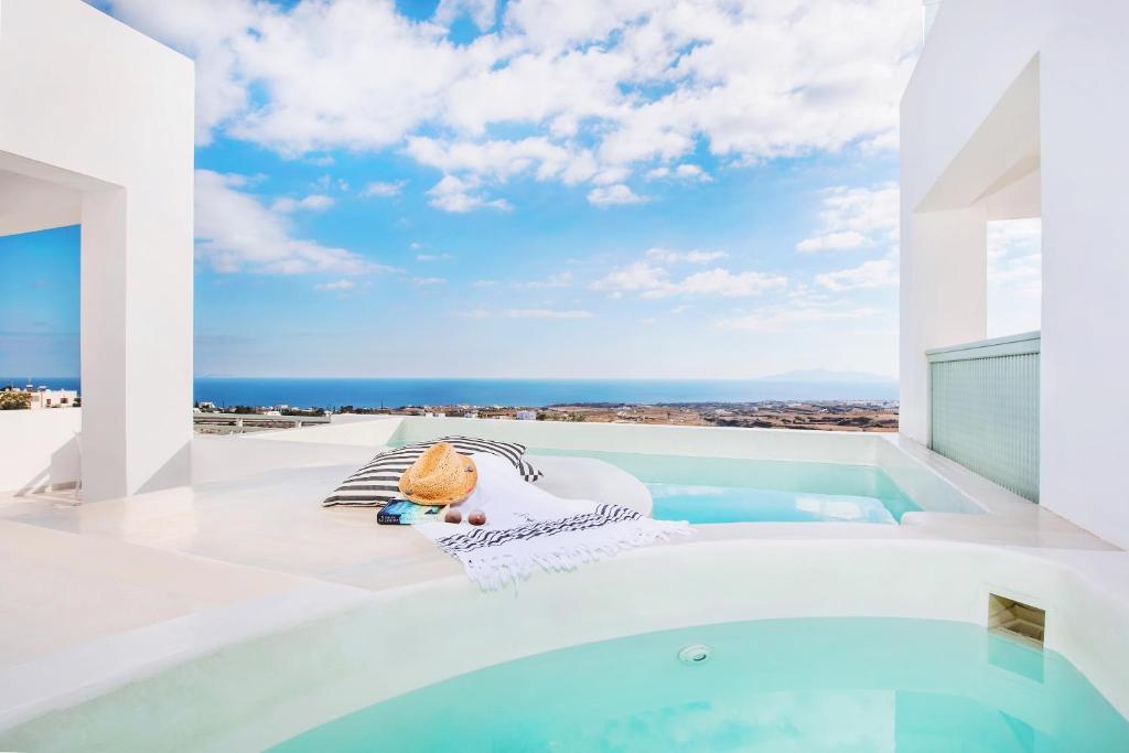 Il propose un centre de bien-être, une piscine et des chambres offrant une vue imprenable sur la mer Égée.