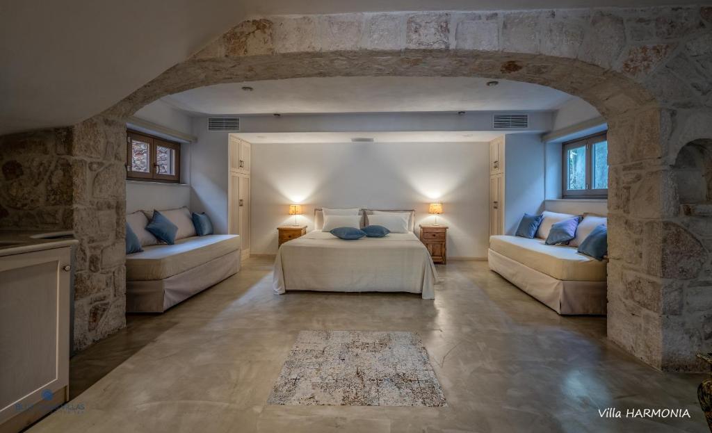 Les villas traditionnelles sont construites en pierre. Elles possèdent un élégant salon doté d'une cheminée et de grandes fenêtres avec vue sur la mer, ainsi qu'une cuisine moderne avec coin repas. Un panier de bienvenue avec des fruits et des boissons vous attend à l'arrivée. Des repas peuvent être préparés sur demande.